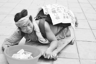 下午4時(shí)許,中年男子將自行車藏在樹后,變成一名衣衫襤褸的乞討者出現(xiàn)在眾人眼前。他趴在一個(gè)木板上,木板下邊有4個(gè)小輪子,他用胳膊和右腿支撐地面,身體通過滑板向前滑動。他的背上還貼著一張寫有“痛苦家世”和“悲慘往事”條幅。他滿臉淚痕,伴著嗚嗚的哭聲,引來很多行人關(guān)注。記者看到,短短5分鐘內(nèi),就有十幾名市民把錢放入他面前的塑料盆中。