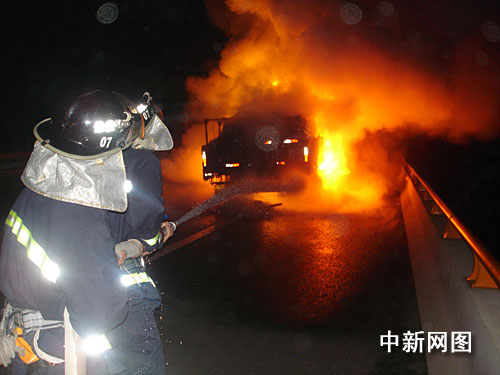 當(dāng)日凌晨,一輛由連云港開(kāi)往廣州的大貨車在駛至寧連高速南京方向159公里處時(shí),駕駛員無(wú)意中通過(guò)后視鏡發(fā)現(xiàn)貨車左后輪胎起火,于是趕緊將車?康铰愤叄杆偃〕鰷缁鹌鬟M(jìn)行滅火并報(bào)警。但滅火器很快被用完,大火仍然猛烈燃燒,附近沒(méi)有任何水源,無(wú)奈之下,司機(jī)只得等待著消防官兵到來(lái)。
