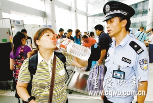 昨日下午2時許,(重慶市)龍頭寺候車廳檢票處,凡是拿著礦泉水瓶進(jìn)站的乘客,都要先喝一口,然后才能順利進(jìn)站。據(jù)悉,這是重慶鐵路公安處新出臺的安檢規(guī)定:凡液狀體物品進(jìn)站,一律開瓶檢查,而自帶飲料的,則必須親自喝一口。