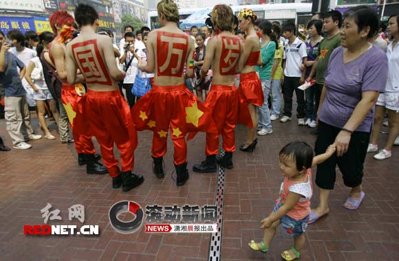 原來,5名自稱90后的男女,身上被涂彩繪,發(fā)型怪異,穿著國旗短褲,背上分別寫著“祖國萬歲”四個字,在這里搞行為藝術(shù)。另外一名妖艷女子,則在給路人發(fā)放紅色傳單。
