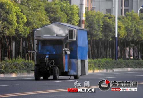 從房車的正面來(lái)看,該房的主體就完全顯露出來(lái)了,車的前部是一輛舊式手扶拖拉車,輪胎、水箱、傳動(dòng)皮帶一應(yīng)俱全;中部是駕駛室主體,跟街頭常見的殘疾車一樣。主要由駕駛室、前面檔風(fēng)玻璃、觀后鏡,一樣都不少,更讓人稱奇的是這輛房車騎駛室頂端(即觀后鏡上方),裝著一臺(tái)空調(diào)掛機(jī)的主機(jī),顯示這臺(tái)房車即便是在炎熱的夏天,也依然能照常使用。房車后部則是主體部分,鋁合金制的車廂、三角形車頂、兩個(gè)后輪,構(gòu)成一輛移動(dòng)的房車。