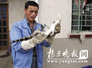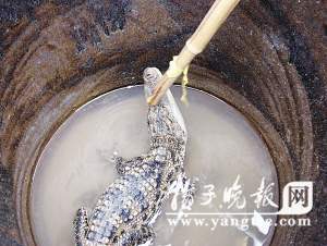 昨天上午,記者接到市民董先生的報料來到了江寧谷里孝義村111號,周國喜正蹲在一個大缸前,旁邊還有幾位村民在指指點點。記者走近一看,只見一只長約80厘米的小鱷魚正在缸底,頭部往上翹,尾部不停地甩動,看上去很緊張。盡管這條小鱷魚給周國喜帶來了不小的損失,可他沒有絲毫的恨意,反倒細心照顧起來!斑@個魚塘我一直在養(yǎng)魚,每年2月份和6月份都投放一次魚苗,總共1萬多條,鳊魚、鯽魚都有!敝車舱f,可讓他奇怪的是,產(chǎn)量都不高。周國喜曾研究過多次,可沒有任何結果,這讓他百思不得其解?删驮诮衲8月份的時候,周國喜在清理魚塘時,突然發(fā)現(xiàn)一只小怪物伸出了頭,嘴巴長又尖!熬褪撬,我當時確定魚塘產(chǎn)量不高就是因為這只小怪獸!敝車哺嬖V記者,他自此開始盯著魚塘,可小怪獸很警惕,大都在魚塘底,很難發(fā)現(xiàn)。功夫不負有心人,通過近半個月的觀察,周國喜發(fā)現(xiàn)小怪獸喜歡上岸睡覺,不過是在對岸的水花生上面,很難捕捉!拔舶秃荛L,嘴很尖,身上顏色黃黑相間!敝車舱f第一眼看到小怪獸就覺得像是鱷魚,不過他不敢確認,于是喊來了弟弟,結果弟弟覺得像是國家一級保護動物揚子鱷。