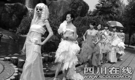 活動現(xiàn)場,七八名大學生美女志愿者身穿五顏六色,用紙袋、塑料袋、筷子和孔雀羽毛等奇異材料制成的服裝為游客們獻上了一場別出心裁的時裝秀,向每一位游客宣傳環(huán)保理念。據了解,這些紙裝是武漢一高校服裝設計專業(yè)的學生精心制作的,他們希望和成都的同學共同呼吁市民愛護環(huán)境。來自武
