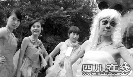 “怎么把眼睛和鼻子都涂黑了呀?哦!原來是熊貓模特兒,看,身上還畫了竹子呢!”昨日上午,在成都塔子山公園鳥語林,一位美女模特頭戴白色假發(fā),眼睛、鼻子都被涂成黑色,把自己裝扮成一只大熊貓。除了這種人體彩繪,參加活動的大學生志愿者還表演了一場精彩的環(huán)保紙裝秀,她們用這種健康、綠色、和諧的方式來向大家倡導環(huán)保理念,吸引了眾多游人觀看。