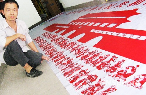 二十四日,記者看到,該剪紙長(zhǎng)約十米,寬兩米,以紅白兩色為主,線條活潑流暢,人物形態(tài)逼真。剪紙上方為“熱烈慶祝中華人民共和國(guó)成立六十周年”十七個(gè)大字;中間接紅色天安門城樓,顯得巍峨壯觀;再往下是天安門廣場(chǎng),五十六個(gè)民族的代表分兩行排列,身著獨(dú)具民族特色的服飾,或歡歌或舞蹈,五十六個(gè)民族團(tuán)結(jié)一致、喜迎國(guó)慶之情躍然于紙上。
