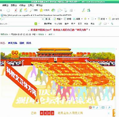 網(wǎng)友“l(fā)eining”加入方陣后說,“國慶,出個(gè)網(wǎng)民方陣也不錯(cuò),喜歡熱鬧的網(wǎng)友可以踴躍參加”!發(fā)ein-ing”還提議,以后可以多在網(wǎng)上做慶典,網(wǎng)慶的最大好處是簡約、文明、時(shí)尚。有網(wǎng)友就說:“我想?yún)⑴c其中,唱著歌,踏著正步,注視著天安門,熱淚盈眶,祖國萬歲!”
