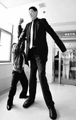 今年27歲的趙亮是濮陽南樂縣梁村鄉(xiāng)西崇町村人,身高2.46米,這一高度比姚明高20厘米、比曾有“世界第一巨人”之稱的鮑喜順還高出10厘米,是名副其實的“第一高人”。趙亮16歲時身高就已達到1.90米,17歲時被推薦到河南省體;@球隊,在一次扣籃時左腳扭傷,一直未能痊愈。今年4月,天津一家醫(yī)院免費為趙亮進行了腳傷手術(shù)。不久,成為媒體關(guān)注焦點的趙亮被歐寶地板聘請,成為公司一名管理人員。上班后,趙亮作為企業(yè)形象大使備受社會關(guān)注。