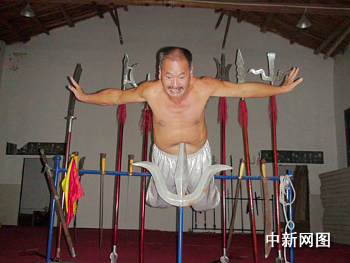 中新網(wǎng)永春10月12日電 (林永傳 顏堯民 施由森)以腹部作為支點(diǎn),雙腳支在鐵欄上,然后整個(gè)人身體懸空,普通人一般無法做到這點(diǎn),而福建永春縣白鶴拳師顏大石卻可以以鋒利的鋼叉作為支點(diǎn),整個(gè)人懸空,其白鶴內(nèi)功令人叫絕。