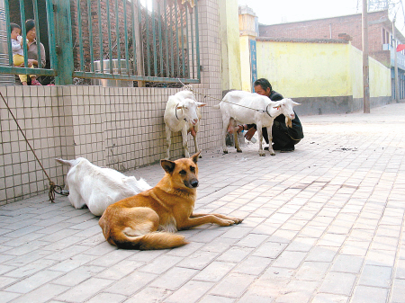 幾天前,記者在韋曲街道見到了老魏,老魏正忙著擠羊奶。老魏告訴記者,他養(yǎng)這4只奶山羊,“虎子”幫了大忙咧。老魏說的“虎子”其實就是臥在4只羊跟前的一條黃狗!斑@虎子今年才3歲,可真是羊的鐵桿保鏢!崩衔撼鲩T賣羊奶,他背個手在前面走,“虎子”領(lǐng)著羊兒跟在后面。到了下午,老魏到坡上放羊。他把“虎子”叫到羊跟前,吩咐一聲“把羊看好”后,便忙別的事!盎⒆印笨墒潜M職盡責(zé),一直守在羊跟前,生人要想靠近羊兒連門都沒有。天快黑了,老魏來到坡下,“回家咧!”一聲吆喝,“虎子”領(lǐng)著羊群順溜溜地下了坡!3年來,還沒丟過羊呢。”老魏說起虎子來贊不絕口。
