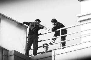 在該大廈樓頂?shù)奈髂辖,一男子站在樓頂護(hù)欄外,雙手握著欄桿,并不時(shí)扭動(dòng)著身體。為避免該男子情緒波動(dòng),警方一邊勸說該男子,一邊疏散圍觀群眾。