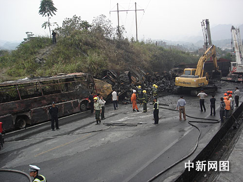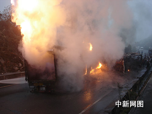 由于集裝箱上滿載約十八噸的膠水和家俱,碰撞后很快起火,大客車與運礦大貨車亦不能幸免。南丹消防官兵接警趕至時,發(fā)現(xiàn)現(xiàn)場火光沖天成了火海,其中集裝箱大卡車正猛烈燃燒,而大客車和運礦大貨車不久后也被燒成廢鐵。消防官兵隨后出動水槍滅火,四輛消防水車頻繁往返縣城運水達二十多車次。救援工作至十八日下午六時許才結(jié)束。