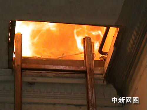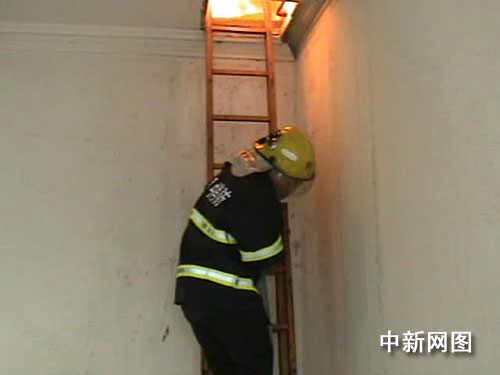 由于火場在樓頂、且入口處較小,消防隊員立即拿來了一把6米兩節(jié)拉梯,由一號車出一支水槍進行強攻滅火。