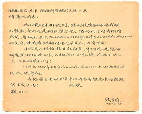 隨后,譚暑生每當(dāng)在學(xué)術(shù)研究過(guò)程中有什么新的進(jìn)展,或者遇到什么困惑,他都會(huì)寫信給錢學(xué)森,而錢學(xué)森基本上也會(huì)每信必回。為了讓譚暑生能潛心于科學(xué)研究工作,錢學(xué)森還多次給國(guó)防科大領(lǐng)導(dǎo)寫信,說(shuō)“譚暑生的研究室做理論工作,大概花不了什么錢,應(yīng)該下決心干!