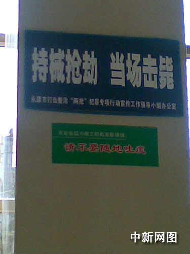 中新網(wǎng)永康11月5日電(記者 陳國亮 古其錚)中新網(wǎng)記者今天在浙江永康采訪時發(fā)現(xiàn),幾天前在該市街頭還能見到的一些“持械搶劫 ,當(dāng)場擊斃”標(biāo)語如今已經(jīng)不見。而永康市政法委及永康市公安局相關(guān)負(fù)責(zé)人11月4日在面見中新網(wǎng)記者時也通過口頭和書面等方式表示,他們以前張貼的標(biāo)語中確實(shí)有幾種標(biāo)語在用語上存在不夠嚴(yán)謹(jǐn)?shù)膯栴}。