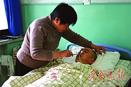 11月3日,平陰縣人民醫(yī)院神經(jīng)內(nèi)科病房?jī)?nèi),李傳華靜靜地躺著,一動(dòng)不動(dòng)。他就是黃文芝的丈夫,近六年前病倒在工作崗位上的一名警察。他成為植物人快六年了,黃文芝在病床左右守候了近六年。