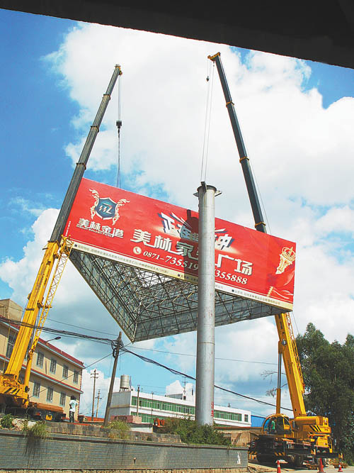 9月18日,記者在昆明國(guó)際會(huì)展中心附近看到,兩棵單立柱廣告牌正在被大吊車吊起。隨后幾天,記者在昆明的城南、城北地區(qū)都看到有關(guān)部門(mén)在拆除戶外廣告牌。記者從昆明市城管局獲悉,截至9月24日,昆明市主城區(qū)共拆除單立柱200棵。其中,五華區(qū)、高新區(qū)、度假區(qū)、呈貢已提前完成拆除任務(wù)。盤(pán)龍區(qū)、經(jīng)濟(jì)技術(shù)開(kāi)發(fā)區(qū)也開(kāi)始拆除高等級(jí)道路兩側(cè)的單立柱廣告。在昆明當(dāng)?shù)兀S嗟膯瘟⒅鶑V告已經(jīng)屈指可數(shù)。