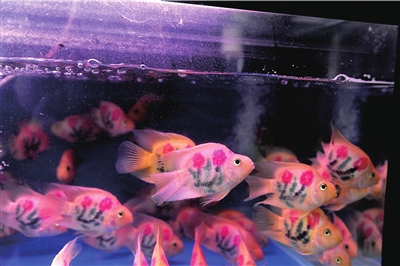 記者走訪了位于高碑店附近的幾個(gè)水族區(qū),發(fā)現(xiàn)都有這種文身魚出售。這種魚有成人手掌大小,魚身上刻有玫瑰花和各種寓意發(fā)財(cái)吉祥的圖案。文身魚主要有兩個(gè)品種,一種叫“鸚鵡”的紅黃色熱帶魚,另一種是有著兩條長長胡須的白色“招財(cái)魚”。