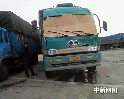 車停下后,只見該車司機被凍的臉色發(fā)紫,不停地搓手取暖。詢問得知,該司機姓李,山東人,幾天前李某到武漢拉貨,在湖北境內發(fā)生交通事故,導致貨車駕駛室前部凹陷,擋風玻璃破碎。為趕時間送貨,于是李某找來廢舊紙板代替擋風玻璃。李某告訴民警,車多時他就把頭伸出駕駛室看方向,伸累了就憑感覺判斷方向開車,他就這樣提心吊膽的行駛了數百公里。