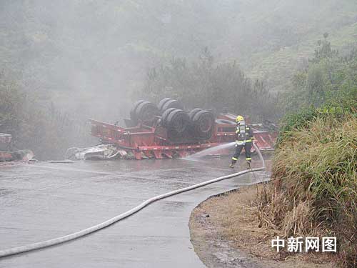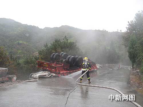 見此情況后,中隊指揮員對事故現(xiàn)場立即進行警戒,出兩支水槍進行稀釋。樂清市政府得悉情況后,立即起動應(yīng)急預(yù)案,并調(diào)集公安、安監(jiān)、環(huán)保、交通、路政等相關(guān)部門趕赴現(xiàn)場處置。