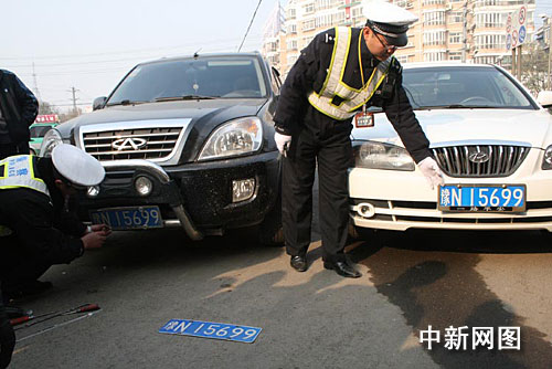 據(jù)交警二大隊嚴管街中隊長梁輝介紹,象這種套牌的嚴重交通違法行為,應將車輛暫扣,收繳非法號牌,并處于2000元以下罰款。完