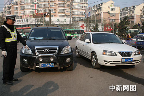 當日上午9時10分,正在文化路崗執(zhí)勤的交警二大隊民警李磊看到一中年人急匆匆向他跑來,“民警同志,快攔住這輛等紅燈的奇瑞車,它掛的牌照和我的一樣,是一輛套牌車!泵窬斒氯说氖种傅姆较蛲,果然見一前一后停著兩輛轎車,前車是一輛黑色奇瑞,后面是一輛白色現(xiàn)代,而兩車的號牌都是予N15699。