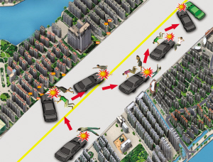 之后,張明寶駕車?yán)^續(xù)向前行駛,撞上一輛愛麗舍轎車尾部,致使該車與前方一輛轎車追尾。此時(shí),張明寶車上的安全氣囊彈開,繼續(xù)向前行駛437米后,停在明月港灣幼兒園門前。從后面追上來的見義勇為市民憤怒地將其摁住,巡邏民警迅速趕到,將其抓獲。上述過程共有5人死亡,4人受傷。還有6輛機(jī)動車不同程度損壞,損失價(jià)值5萬多元。