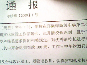 昨天上午,記者根據(jù)網(wǎng)友提供的地址打開(kāi)該網(wǎng)頁(yè)時(shí),發(fā)現(xiàn)了一篇題為《最猛校長(zhǎng)》的帖子,一則蓋有“鄭梁梅學(xué)!惫碌耐▓(bào)內(nèi)容稱(chēng):12月11日下午1時(shí),學(xué)校在鄭梁梅第二會(huì)議室組織召開(kāi)各學(xué)部校園文化建設(shè)工作部署會(huì),因校長(zhǎng)沈秀清遲到,且在工作日中午喝酒,所以根據(jù)學(xué)校獎(jiǎng)懲條例相關(guān)規(guī)定,對(duì)沈秀清校長(zhǎng)通報(bào)批評(píng)并罰款600元。在帖子里,記者發(fā)現(xiàn)600元罰款分兩種:開(kāi)會(huì)遲到罰款100元,工作日中午飲酒罰款500元。