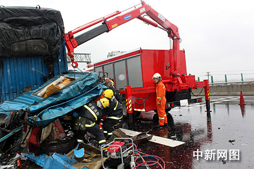 今天早上8時(shí)許,高速寧波支隊(duì)指揮中心接到報(bào)警稱在繞城高速姜山北互通附近有兩車追尾,有人受傷,且傷勢(shì)較重。接警后,四大隊(duì)巡邏民警立即趕赴現(xiàn)場(chǎng)。到達(dá)事故現(xiàn)場(chǎng)后,民警發(fā)現(xiàn)肇事的是蘇FU3033車牌號(hào)重型廂式貨車和閩A15387號(hào)重型廂式貨車。其中后車閩A15387號(hào)大貨車駕駛室已經(jīng)嚴(yán)重變形,駕駛室在碰撞后,被擠壓成厚度不足1米的“鐵餅”。透過(guò)碰撞的殘骸可以隱約看到有兩人被困車內(nèi),氣息十分微弱,F(xiàn)場(chǎng)民警在展開施救同時(shí),立即要求增援。8時(shí)26分,鄞州消防大隊(duì)接到指令后立即出動(dòng)1輛搶險(xiǎn)救援車、7名消防官兵趕赴現(xiàn)場(chǎng)。