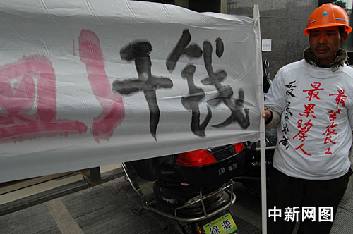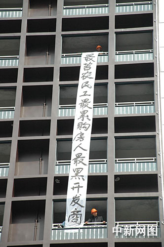 中新網(wǎng)貴港12月16日電 (記者 王剛)16日早,廣西貴港市數(shù)十農(nóng)民工爬上該市市區(qū)最高樓盤(pán)“聯(lián)邦國(guó)際”欲跳樓討薪,情緒激動(dòng)的民工還掛出“最苦農(nóng)民工、最累購(gòu)房人、最黑開(kāi)發(fā)商”、“還我血汗錢”等橫幅聲討開(kāi)發(fā)商。