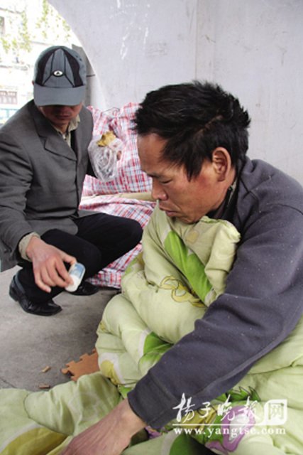 記者隨后來(lái)到“大傻”所睡的位置,發(fā)現(xiàn)這位綽號(hào)“大傻”的民工并沒(méi)有睡著,見(jiàn)到記者也是兩眼迷茫,后來(lái)他告訴記者,自己名叫王震學(xué),今年46歲,安徽阜陽(yáng)人,父母過(guò)世,只剩下自己孤身一人在外打工求生活,由于腿疼、肺部也有毛病,所以干不了重活,20天前得了重感冒,一直以來(lái)發(fā)燒不止,后來(lái)是一位在附近賣烤紅薯的老師傅給他買(mǎi)了一瓶安乃近。和王震學(xué)睡在一起的小湯說(shuō),王震學(xué)已經(jīng)20多天沒(méi)有起過(guò)床,這幾天也是基本吃不下飯,我真怕再不將他送進(jìn)醫(yī)院,他也只有等死了。