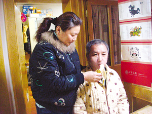 記者離開(kāi)的時(shí)候,金洪寶想吃點(diǎn)香蕉,陳春莉立即拿來(lái)香蕉送到丈夫嘴里,幽默的丈夫說(shuō):“靠近點(diǎn)啊,可別讓第三者插足啊!( 王洛峰 張辰 王娟)