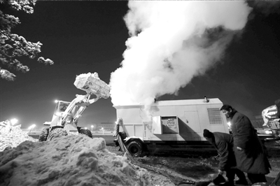 昨天凌晨,在人民大會堂東側(cè)路,環(huán)衛(wèi)集團的新武器“融雪屋”正在進行“吃雪”作業(yè)。鏟車每隔幾分鐘就向“融雪屋”內(nèi)倒入一鏟積雪,隨著一陣白色霧氣升起,積雪就被融雪屋“吃”掉,變成水流進了市政管線。從外表看,“融雪屋”就是一個橘黃色的方形體。負責(zé)操作的高師傅說,不要小瞧這個機器,它每小時能融雪25噸!跋襁@樣低的溫度,即使融雪劑與積雪充分混合,靠自然溫度融化減量也有一定困難,所以我們投入使用了這個新設(shè)備,加快積雪融化!北本┉h(huán)衛(wèi)集團作業(yè)部部長張志強說!