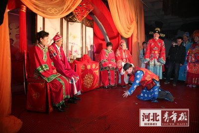 新娘孫蓓說:“現(xiàn)在,人們對傳統(tǒng)的東西都淡化了,我們希望通過自己的行動喚起更多人對傳統(tǒng)文化的興趣!