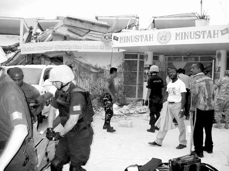 海地時(shí)間1月12日下午4時(shí)50分,太子港發(fā)生地震時(shí),于江樺和在太子港工作的中國(guó)同事劉昆開(kāi)車前往聯(lián)海團(tuán)總部大樓接一位美國(guó)同事。車子在大樓前還沒(méi)停穩(wěn),大家就覺(jué)得車子在晃,一樓已經(jīng)冒出大量白色灰塵并伴隨著轟鳴聲,于江樺和劉昆下車后趕緊向遠(yuǎn)離大樓的地方跑。由于地面在震顫,根本無(wú)法站立,倆人只好蹲下等地震停止。大約30秒鐘后,于江樺和劉昆轉(zhuǎn)過(guò)頭來(lái),看到聯(lián)海團(tuán)總部大樓已經(jīng)完全坍塌。于江樺連忙掏出手機(jī)撥打隊(duì)長(zhǎng)趙化宇的手機(jī),但此時(shí)信號(hào)已經(jīng)中斷。這時(shí)防暴隊(duì)長(zhǎng)說(shuō):“我們的代表團(tuán)正在樓里開(kāi)會(huì)!甭(tīng)到這個(gè)消息后,于江樺的頭一下子就蒙了。