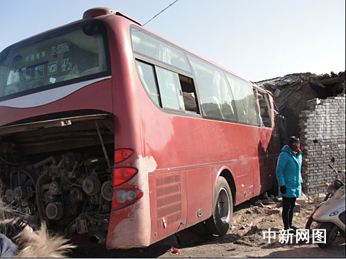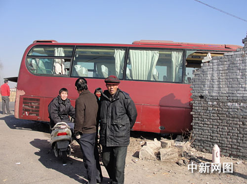 據(jù)現(xiàn)場目擊者稱,大客車是與當?shù)厮痉ú块T的小型轎車發(fā)生碰撞后,由于車速較快,大客車猛然沖進公路旁的民房內,所幸屋內沒人,民房被撞一角嚴重受損,墻體坍塌。