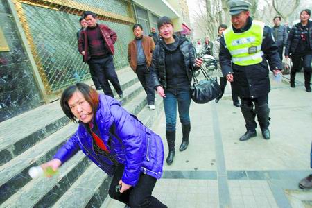 3分鐘后,交警二大隊(duì)民警趕到。在對(duì)違法司機(jī)進(jìn)行處罰時(shí),民警發(fā)現(xiàn)司機(jī)宿輝所駕駛的轎車,登記的是南陽(yáng)市社旗縣晉莊鎮(zhèn)紀(jì)律檢查委員會(huì)所屬車輛。記者拍照時(shí),遭到一名短發(fā)女子阻攔。隨后,又有兩名黑衣女子上前,開(kāi)始搶奪本報(bào)攝影記者閆化莊的相機(jī),并當(dāng)街追打閆化莊,將他的手背抓爛。整個(gè)過(guò)程持續(xù)了十分鐘,一名DV觀察員拍攝追打過(guò)程時(shí),也遭到了這三名女子的圍攻和撕扯,在場(chǎng)交警上前制止,其中兩名女子又沖過(guò)來(lái)毆打記者。先期離開(kāi)的特巡警趕來(lái)制止,三名女子仍不愿罷手。