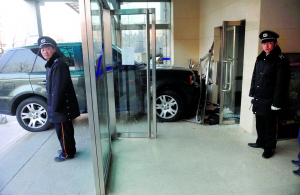 昨日下午4時(shí)許,京版信息港寫(xiě)字樓前,一輛路虎越野車騎在大樓入口處,車身只有擦痕,四周散落著鋁合金框架和玻璃碎片,寫(xiě)字樓大門已經(jīng)被撞碎了一半。
