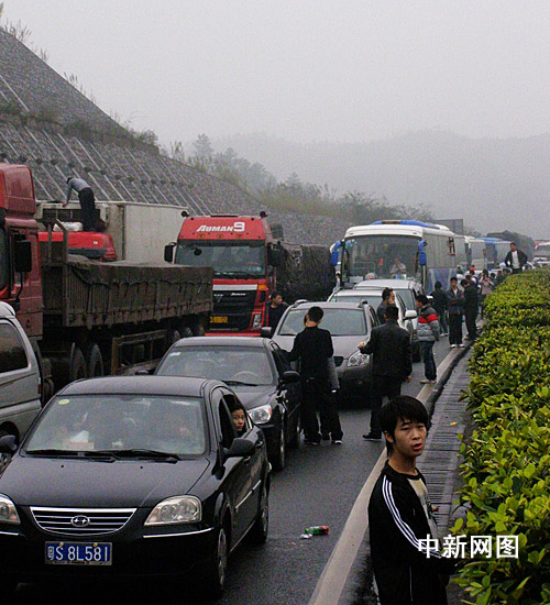 記者當(dāng)日16時30分經(jīng)京珠高速從廣州到韶關(guān),行至清遠(yuǎn)湯塘附近時發(fā)現(xiàn)交通已經(jīng)堵塞,前方北行高速路上堵滿了大大小小的車輛,一眼望不到頭,被堵的車龍長達(dá)5公里。此時,雨一直下著,天氣很冷。一些已經(jīng)被堵了近2小時的乘客一邊吃著食物,一邊焦急等待著。