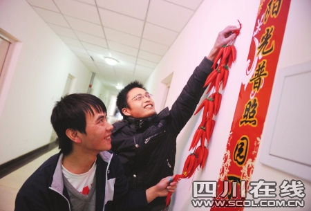 和吳波一樣,成都理工大學(xué)材料化學(xué)院今年春節(jié)就有近20名大學(xué)生留校。他們大多數(shù)來自農(nóng)村、家庭貧困,許多人的父母在沿海打工,春節(jié)的家鄉(xiāng)仍是一座空房。