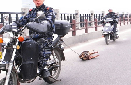 摩托車后系著一條鐵鏈,拖著一只血肉模糊的狗飛奔。昨天,一組被標(biāo)著“慘無人道”標(biāo)題的照片在福州各大論壇瘋傳,甚至被稱為福州版的虐狗門。拍下這些照片的網(wǎng)友表示,在春節(jié)期間看到如此一幕非常難受,而有網(wǎng)友認(rèn)為這可能是有人在偷狗。