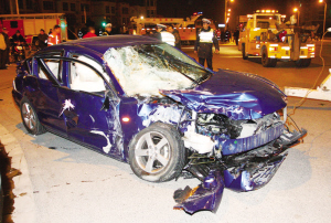 昨天(19日)下午5時(shí)15分許,(上海)浦東御橋路浦三路口處發(fā)生意外,一輛消防車與一小轎車在行駛中發(fā)生碰撞,消防車在沖倒路邊的欄桿和燈柱后側(cè)翻在地,小汽車則被反向甩出近20米遠(yuǎn),車內(nèi)一名新婚女子和一3月大的男嬰身受重傷,情勢危急,另有十余人輕傷。