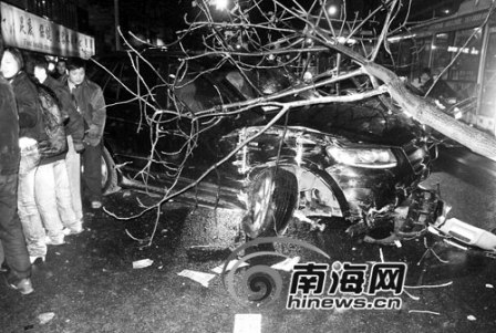 據目擊群眾介紹:當時這輛越野車從五指山路一單位開出來,越道沖到馬路對面“新香梅休閑中心”前的人行道上來。當時正在清掃馬路的一名女清潔工急忙閃到一邊,她清運垃圾的拖車被這輛越野車撞翻在地,車被撞散架,整車的垃圾全部倒了出來。接著,這輛越野車撞斷人行道上的一棵碗口粗的遮蔭樹,把停在人行道上2輛摩托車撞倒后,并沒有停下來,它沿著人行道往前沖,沖出50多米遠后,又在芳草園前面的人行道上撞破了一處墻角,撞倒了5輛停放好的摩托車,并把一棵碗口粗的遮蔭樹撞斷后連根帶走,還把路邊一位準備騎電動摩托車的男子撞飛。肇事車接著從人行道開到五指山路上后,汽車的右前輪拐斷倒向一邊,開不動后才停下來。從這輛肇事車上隨后下來幾名男子。交警趕到現場后,把肇事司機帶到了交警事故處理車上。那名被撞傷的男子隨后被120救護車送往醫(yī)院。