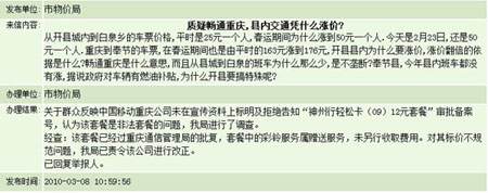 市民在公開(kāi)郵箱中明確反映,春運(yùn)期間,由開(kāi)縣城內(nèi)往返白泉鄉(xiāng)的車(chē)票價(jià)格從平日的25元漲至50元,瘋狂漲價(jià)不知依據(jù)為何?讓人忍俊不禁的是,市物價(jià)局的回復(fù)圍繞著一條對(duì)通訊行業(yè)投訴的展開(kāi),答非所問(wèn)。