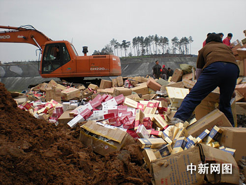 15日上午10時(shí),伴隨著大型壓路機(jī)和挖掘機(jī)工作的隆隆聲,3萬多條假冒卷煙在宜昌市夷陵區(qū)丁家壩垃圾處理場被碾壓后填埋銷毀。