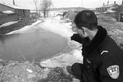 25日14時許,記者來到位于依蘭縣宏克力鎮(zhèn)東北方向的三義村,在村前路口轉(zhuǎn)彎處,記者見到一個寬約10米,長約40余米的條狀大坑,這里就是三個孩子出事的地方。此時的大坑水面上仍結(jié)著冰,但部分冰面已經(jīng)破碎,水面上還冒著熱氣。大坑周圍已經(jīng)圍上了繩索,一塊木板警示牌上面寫著“此處水深危險”,紅色的油漆還沒有干。附近的居民告訴記者,這塊木牌和攔坑的繩索都是今天早晨才設立的。