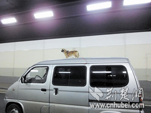 在一輛快速行駛的面包車的頂上,站著一只小狗。昨日,一組標(biāo)題為“武漢長江隧道內(nèi)虐狗門事”的照片出現(xiàn)在網(wǎng)上。