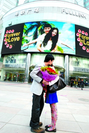 昨天傍晚,22歲的北京女孩婷婷和男友約好了在豐聯(lián)廣場的大屏幕下見面,當她剛在大屏幕下停下腳的一剎那,大屏幕上竟傳出了男友叫她的聲音,隨即就是一大段愛情告白和浪漫求婚,婷婷抬頭望著大屏幕,大屏幕上傳出來的是《今天你要嫁給我》的浪漫音樂,畫面上卻是她和男友的一張張?zhí)鹈劭s影,還有正在向自己求婚的男友,真真切切,一時間她愣住了神。2分55秒過后,這段求婚視頻播放完畢,男友從豐聯(lián)廣場里小心翼翼地走了出來,期待著婷婷的點頭答應。婷婷這才相信,這真的是男友向她的求婚,她拭去晶瑩的淚花,奔向男友的懷抱,緊緊相擁。這一瞬間感動了圍觀的群眾,大家熱烈鼓掌,祝福這對帥哥美女終成眷屬。