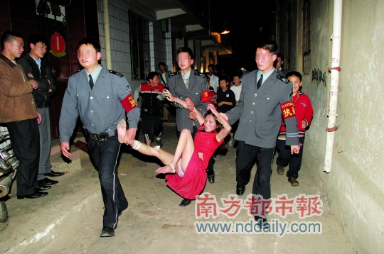 “我那天去晚了,本來(lái)是在這個(gè)城中村拍其他的,聽到爆料說(shuō)有人跳樓就趕了過(guò)去。”時(shí)任昆明《都市時(shí)報(bào)》攝影記者的黃興能對(duì)南都記者說(shuō),“我趕到的時(shí)候人已經(jīng)被消防救了下來(lái),然后就把人交給了聯(lián)防隊(duì)員,但她還在不停掙扎,這時(shí)候,照片中左邊第一個(gè)聯(lián)防只好抬起女子的右腳往前走,我恰好捕捉到了這個(gè)瞬間。在拉的過(guò)程中,這名女子一直強(qiáng)烈反抗。最后把她抬進(jìn)了治安崗?fù)。?/p>