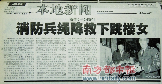 2004年3月13日,昆明李家堆221號(hào),26歲的李某站在窗臺(tái)上,準(zhǔn)備第二次自殺。據(jù)稱因?yàn)檎煞蚺c其他女人有染,她去年曾經(jīng)跳過(guò)一次樓,沒(méi)有死成,此時(shí)腿上還有傷。這次,她被迅速趕來(lái)的民警勸說(shuō)緩了一緩。消防員從樓上繩降而下,成功把她給救了下來(lái)。