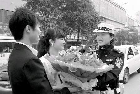 綿陽一對(duì)新人的婚車車隊(duì)在如潮的車流中難以前行,綿陽交警直屬一大隊(duì)女子警組民警吳莎了解情況后,開著交警流動(dòng)服務(wù)車引道,順利將車隊(duì)帶到酒店。昨日上午,新郎新娘抱著鮮花,幾經(jīng)周折找到“護(hù)嫁天使”吳莎,表示感謝。綿陽和成都市民紛紛撥打本報(bào)綿陽新聞熱線表示,交警吳莎為普通老百姓的婚車引道,既疏導(dǎo)了交通,又體現(xiàn)了交警的人性化執(zhí)法。